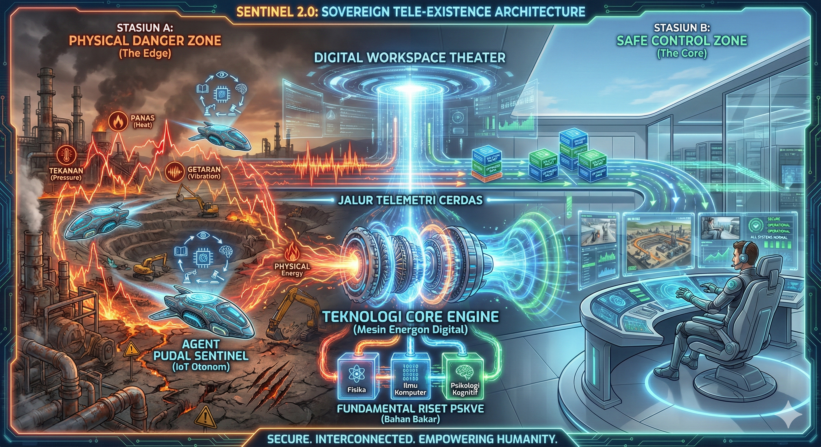 Singkatnya, SENTINEL 2.0 adalah arsitektur full-stack untuk Tele-Eksistensi: dimulai dari Riset Fisika Sensor (bahan bakar), ditenagai oleh Algoritma AI (CORE engine), dieksekusi oleh Node IoT Cerdas (Agen PUDAL), yang berjalan di atas Jalur Telemetri Aman, untuk memindahkan Value keselamatan dari Zona Bahaya ke Zona Aman, menciptakan lingkungan kerja industri yang memanusiakan manusia.
